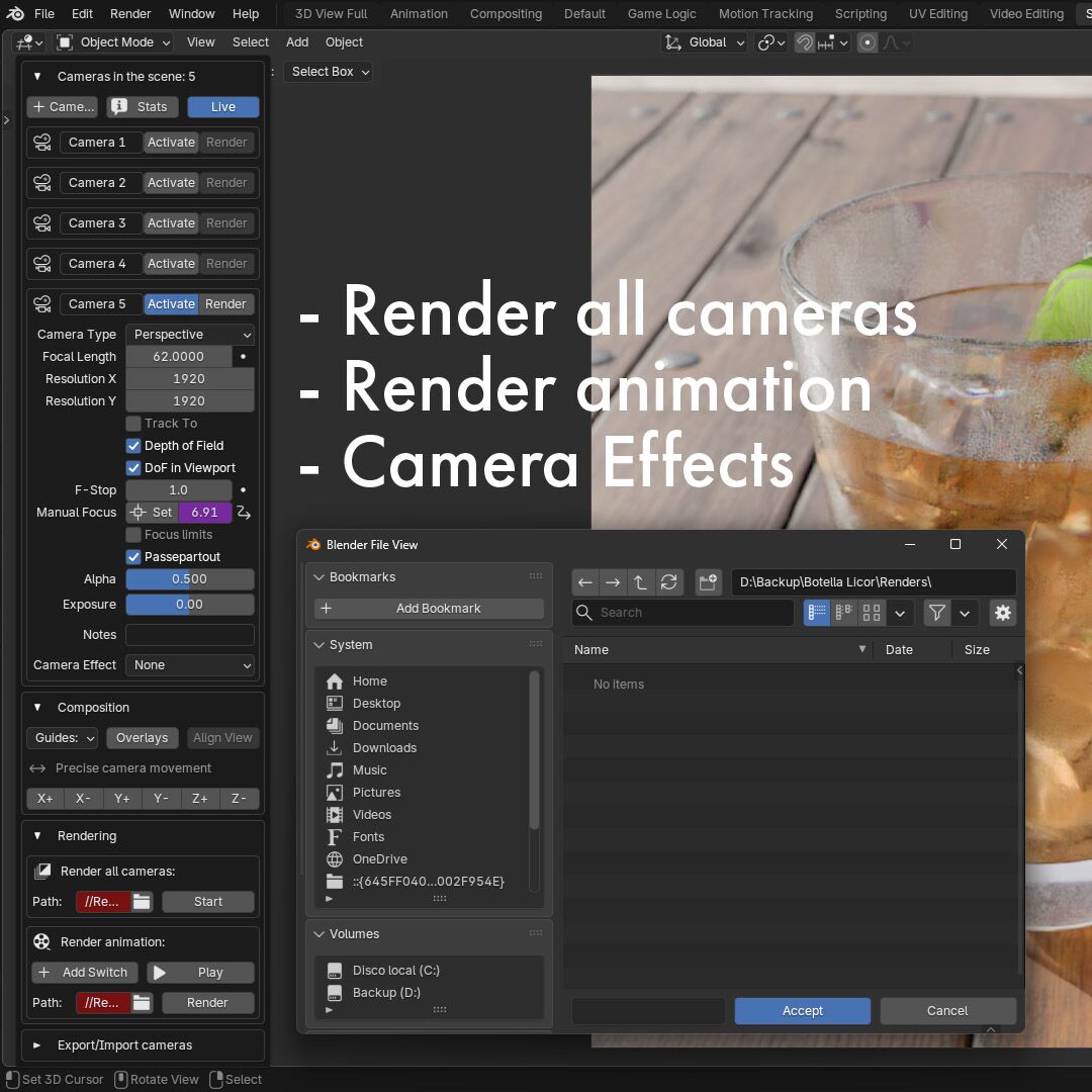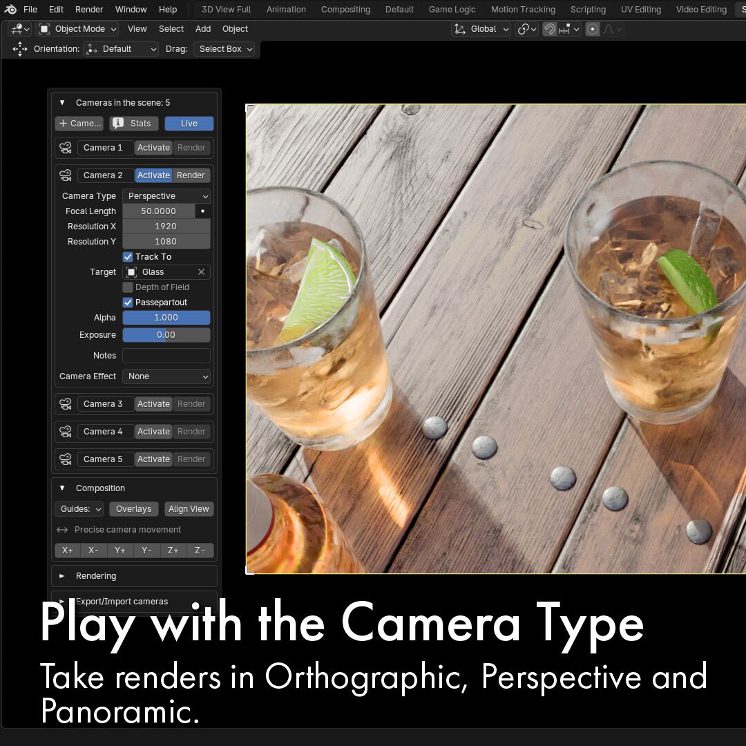 Este addon está diseñado para usar en Blender. Te permitirá controlar todas las cámaras que tengas en tu escena.